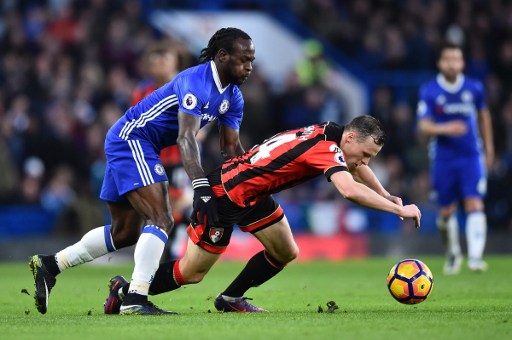 Chelsea's Nigerian midfielder Victor Moses (L) vies with Bournemouth's Australian midfielder Brad Smith (R) during the English Premier League football match between Chelsea and Bournemouth at Stamford Bridge in London on December 26, 2016. / AFP PHOTO / Glyn KIRK / RESTRICTED TO EDITORIAL USE. No use with unauthorized audio, video, data, fixture lists, club/league logos or 'live' services. Online in-match use limited to 75 images, no video emulation. No use in betting, games or single club/league/player publications. /