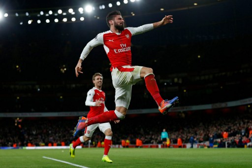 Arsenal's French striker Olivier Giroud celebrates after scoring the opening goal of the English Premier League football match between Arsenal and West Bromwich Albion at the Emirates Stadium in London on December 26, 2016. Arsenal won the game 1-0. / AFP PHOTO / IAN KINGTON / RESTRICTED TO EDITORIAL USE. No use with unauthorized audio, video, data, fixture lists, club/league logos or 'live' services. Online in-match use limited to 75 images, no video emulation. No use in betting, games or single club/league/player publications. /